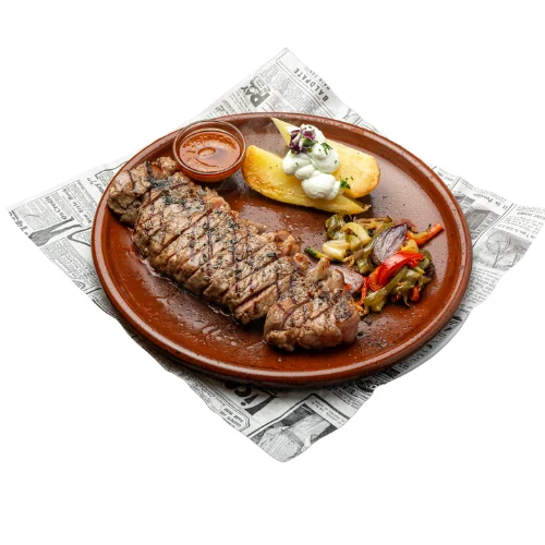Entrecot de ternera a la brasa, jugoso y lleno de sabor, acompañado de patatas y guarnición. | |